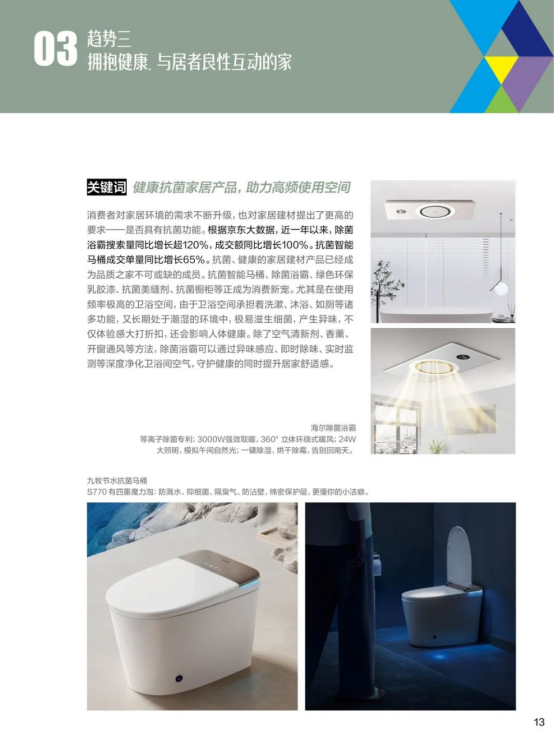 壁挂马桶成交量同比增加超10倍、灯带成交额同比增加130%、踢脚线%、轨道插座成交额同比增加超50%,他们热衷通过多种体例改善家居空气,京东适老马桶、平安扶手、坐式淋浴器搜刮量同比增加80%,按照京东大数据,成交额同比增加超50%,智能浴霸成交单量同比增加超100%,智能浴室柜成交单量同比增加100%。小家扩容成为刚需。是年轻消费者的心仪之选。跟着东方审美、国潮国货的兴起,